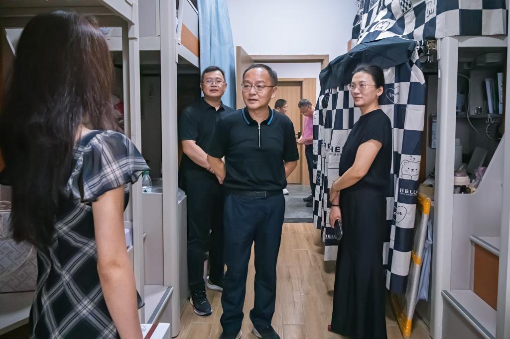 随后,赵阳一行来到秀松书院,深入学生公寓走访看望学生,了解同学们军训期间的生活起居、新建学生公寓的配套设施情况等。