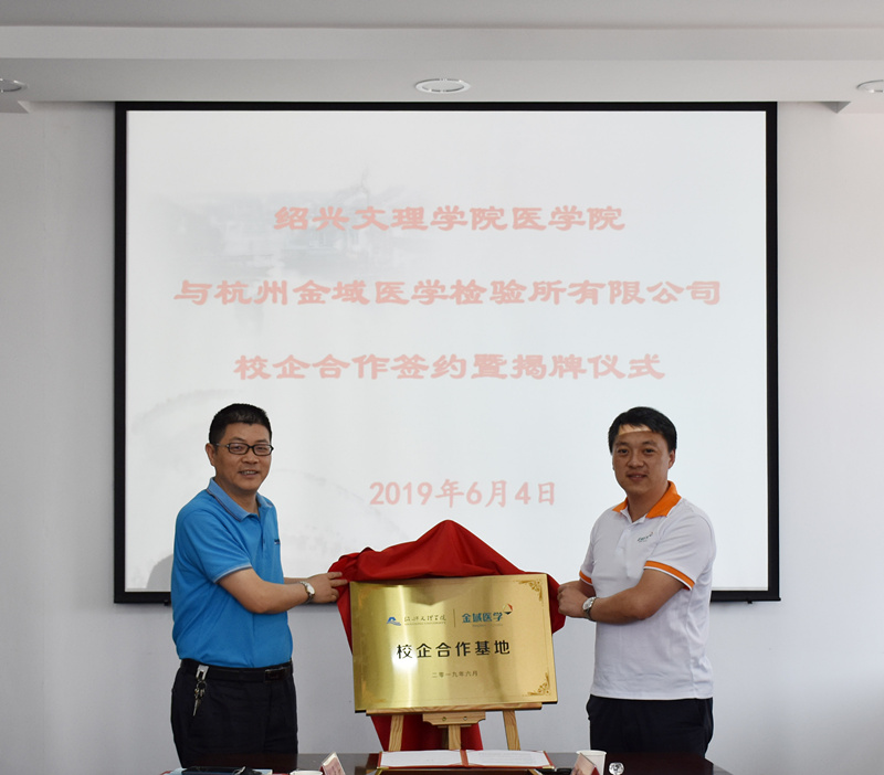 医学院常务副院长葛建荣与杭州金域医学检验所有限公司副总经理祝宇翀代表双方签约揭牌。