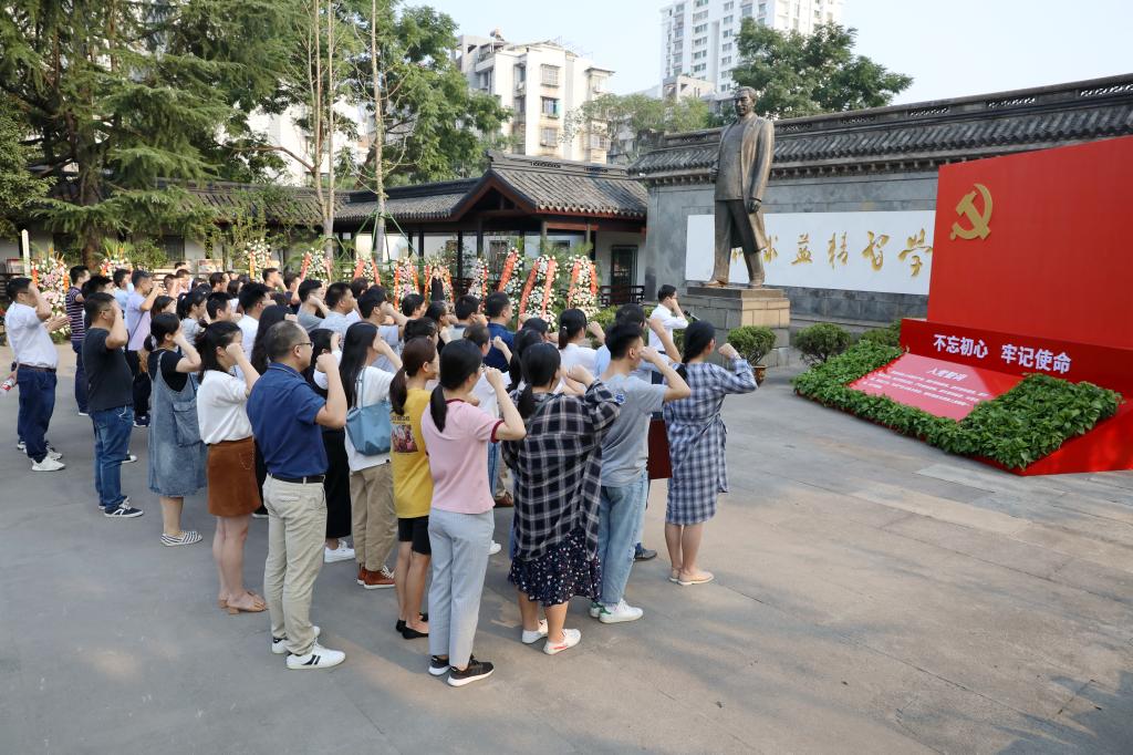 在周恩来铜像前,全体党员在党旗前,高举右拳,重温入党誓词,庄严宣誓。重温入党誓词后,大家怀着崇敬的心情参观周恩来祖居。