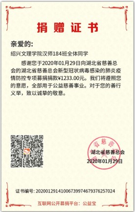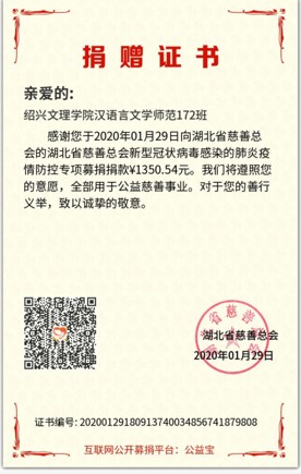 1月30日,学院党委通过网络发起募捐倡议,各党支部和班团支部踊跃捐款,发起倡议1天时间后,向湖北省慈善总会的新冠状病毒防控专项项目捐款16039.94元,捐款还在持续进行中。