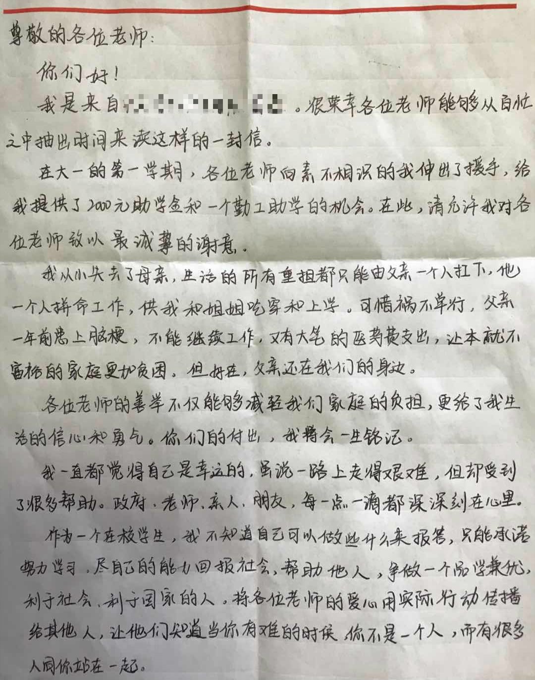 感谢信上,该学生一笔一划认真地写下了自己的心里话:“我一直觉得自己是幸运的,虽说一路走得艰难,但却受到了很多帮助。政府、老师、亲人、朋友,每一点一滴都深深刻在我的心里。作为一个在校生,我只能承诺努力学习,尽自己的能力回报社会,帮助他人,争做一个品学兼优、利于社会,利于国家的人,将各位老师的爱心用实际行动传播给其他人,让他们知道当你有难的时候,你不是一个人,而是有很多人和你站在一起……”