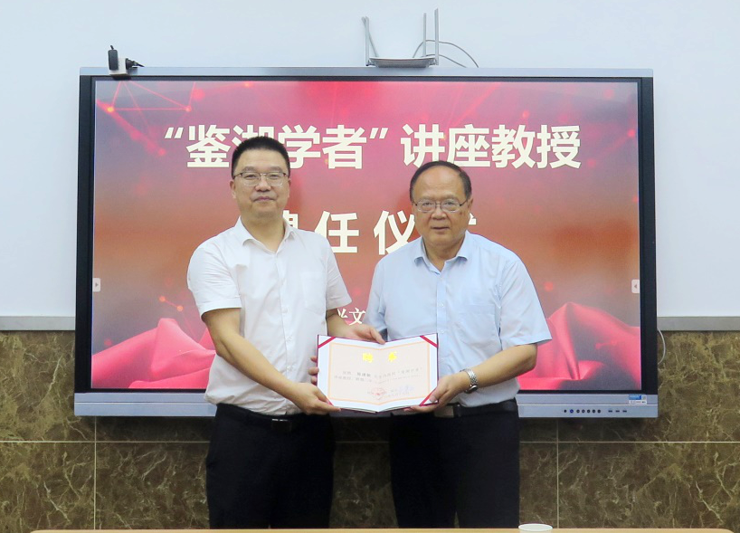 | 陈均土为陈建敏颁发“鉴湖学者”讲座教授聘书 |