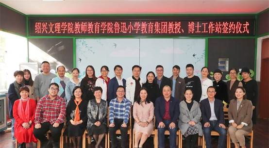 1023日下午,教师教育学院和鲁迅小学教育集团合作的教授、博士工作站签约仪式在在市区鲁迅小学和畅堂校区举行,这也是我市首个小学教授工作站。绍兴市越城区教体局副局长孙建林、教师教育学院院长陈巍、副院长刘雄英、绍兴市鲁迅小学教育集团(总校)校长王慧琴、鲁迅小学教育集团董事会成员以及双方教师代表参加了此次签约仪式。
