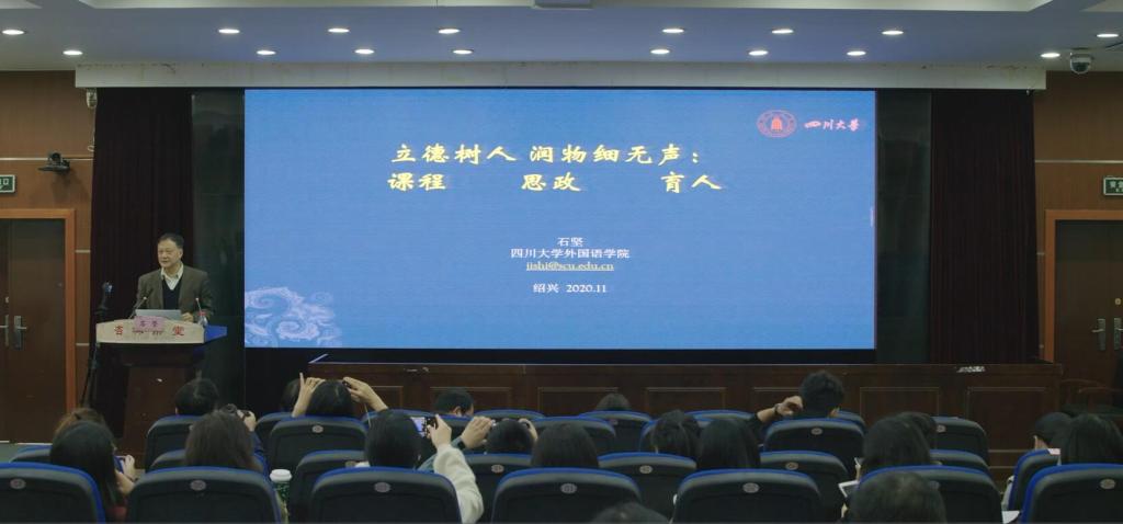 11月13日下午,四川大学原副校长,外国语学院英文系教授、博士生导师,教育部外语专业教学指导委员会英语专业分会副主任委员,教育部高教司大学外语教学改革课题组副组长,四川大学“卓越教学奖”特等奖获得者石坚教授应邀来我校,作题为《立德树人 润物细无声:课程思政与育人》专题讲座。讲座由我校党委委员、宣传部部长梁瑜主持,绍兴市高校课程思政骨干教师、我校课程思政骨干教师及外国语学院全体教师聆听了讲座。