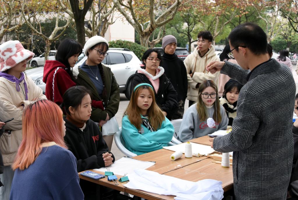 “非遗传承与创意设计实践体验”活动中,邀请到纺织服装学院2009届校友叶科进行现场教学指导。叶科作为青年手作人,毕业后投身传统手工染、织、绣、绘产品的设计制作,带动当地及周边村民20余人从事染材种植、手工制作、产品包装等领域创业。活动以扎染织物为义卖品,参与本次创意设计实践体验与非遗传承义卖活动,义卖所得收入将全部捐入学院壹诺基金会。