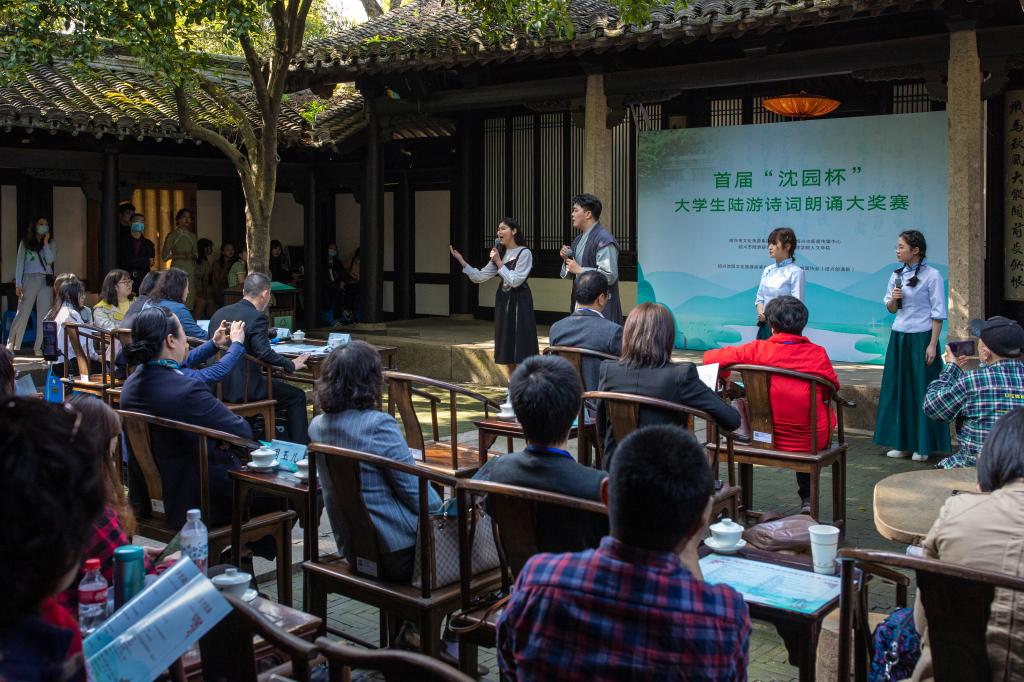 328日下午,由我校人文学院联合绍兴市文化旅游集团有限公司、绍兴市新闻传媒中心、绍兴市陆游研究会主办,绍兴沈园文化旅游发展有限公司与绍兴朗诵协会共同承办的首届“沈园杯”大学生陆游诗词朗诵大奖赛在沈园双桂堂举行。