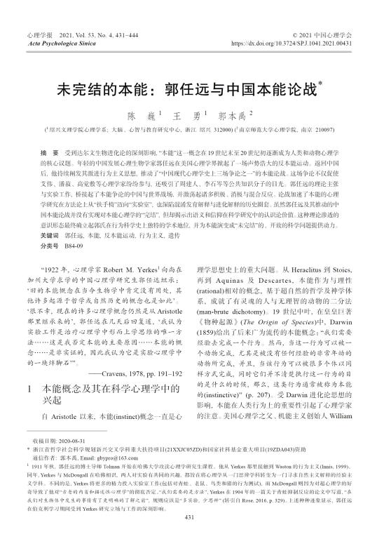 近期,我校心理学学科陈巍教授在权威期刊《心理学报》2021年第4期发表论文《未完结的本能:郭任远与中国本能论战》。该研究也是陈巍教授主持浙江省哲学社会科学规划新兴交叉学科重大扶持项目(21XXJC05ZD)及其作为核心成员参与的国家社科基金重大项目(19ZDA043)的阶段性成果之一。本文第二作者为教师教育学院19级心理健康教育在读硕士研究生王勇。