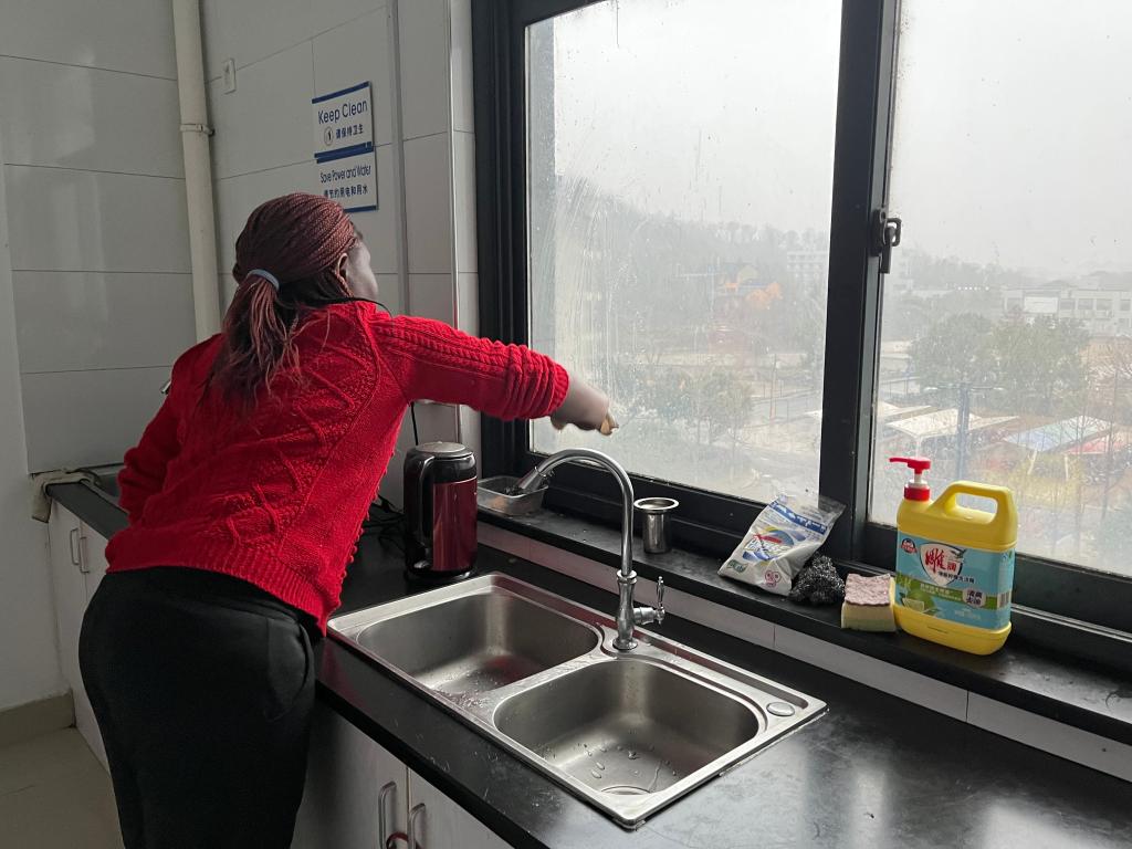 年前掸尘是中国素有的传统习惯。时至小年,留学生们也对自己的宿舍房间、公用厨房进行了彻底的清洁,寄托自己辞旧迎新的愿望。窗明几净后,留学生与国际教育学院老师一起在公共区域贴上“福”字,喜迎新春。