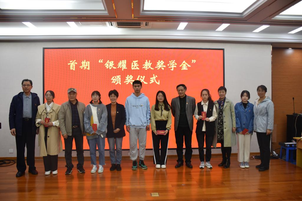 “银耀医教志愿服务队”名誉队长周武强宣读了2022年首期获得“银耀医教奖学金”名单的通知。“银耀医教志愿服务队”与医学院签订“结对”协议书并为获得2022年首期“银耀医教奖学金”的6名学生党员颁发奖金。