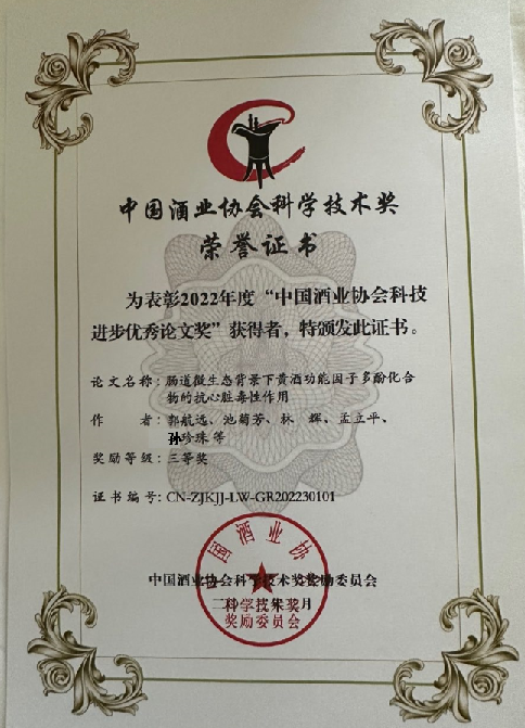 3月26日,山东泰安举办“中国酒业30年庆典”,医学院郭航远、池菊芳、林辉团队的论文“肠道微生态背景下黄酒功能因子多酚化合物的抗心脏毒性作用”(发表于Circulation: Heart Failure,2022年影响因子/JCR分区:10.447/Q1) 荣获中国酒业协会科技奖(论文类)三等奖,这是继去年该团队荣获中国食品工业协会科技进步奖一等奖后的又一奖项。