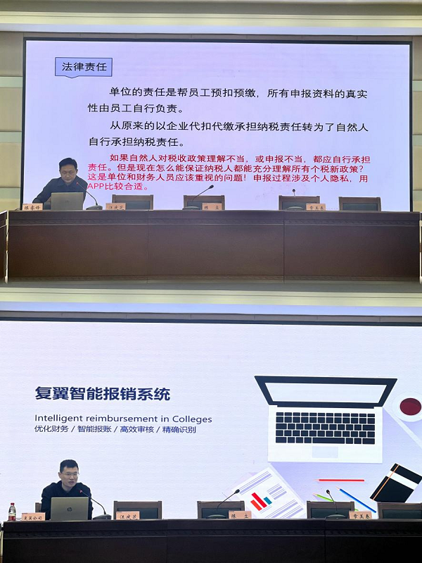启动会后,绍兴天鹰税务师事务所所长陈睿锋和复翼软件公司浙江分公司负责人陆琦分别开展了个税政策宣讲和智能报销系统业务培训。