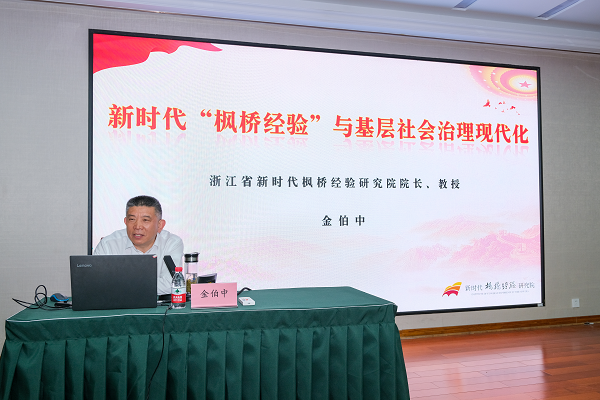 黄坚为金伯中颁发聘书,他充分肯定金伯中教授在“枫桥经验”领域的研究成果,期待学校在金伯中教授的带领下成为“枫桥经验”研究的高地。