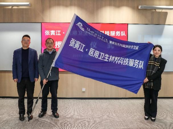 陈均土为“张寅江·医用卫生材料科技服务队”授旗。