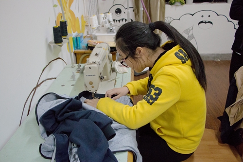 河西校区树人书院2幢108室,一间简单的学生办公室,在一周的时间内面貌一新:洁白的墙壁描上了生动的墙画,缝纫机、熨斗、熨台、衣架、衣柜等工具、设备一应俱全,五彩斑斓的线球整齐地摆成一排。新开业的“衣诺坊”工作室里,来自纺织服装学院“壹诺基金会”的志愿者们佩戴着统一的袖标,迎接着光顾这里的第一批师生们。