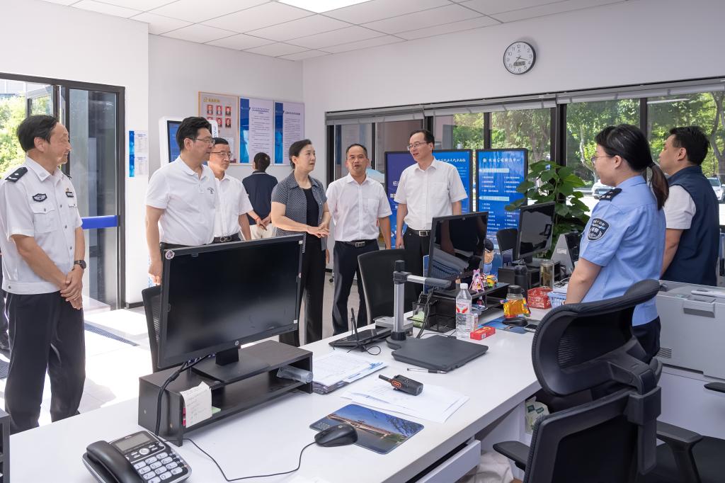 王文序一行实地走访了校警驿站服务大厅、安保联合指挥中心、党员服务中心等地,详细了解了校警驿站运行及服务情况,认真听取了统战及校园安全工作情况汇报。崔凤军表示,学校始终坚持以大平安理念落实总体国家安全观,统筹发展与安全两件大事,并以“枫桥经验”为指引,创新平安校园建设模式,成功创建省级样板“校警驿站”,走在了全省前列。