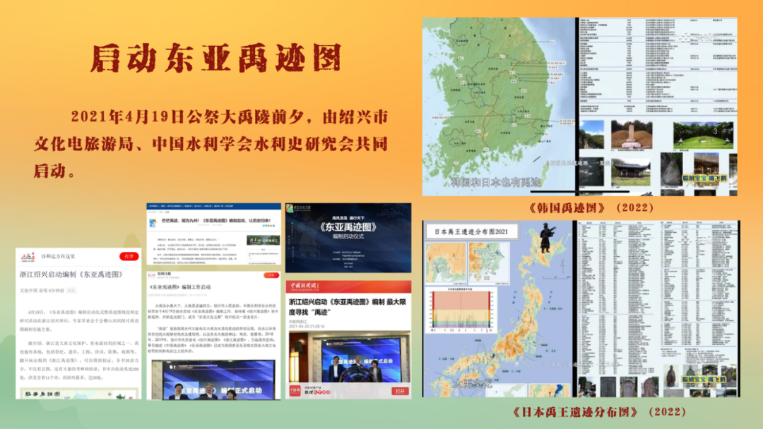 绍兴从2017年底开始编制“禹迹图”、2018年4月16日地方首张《绍兴禹迹图》发布、2019年《浙江禹迹图》出版、2021年《绍兴禹迹标识导读》出版并完成导则编制和64个禹迹桩的落地、2022年4月19日全国首张《中国禹迹图》发布、2024年《中国禹迹图导读》由中国文史出版社出版。历时八年,一群勇毅而果敢的人终于将大禹文化遗产创造性转化,并生动呈现出来,成为文化创新的成功样本。